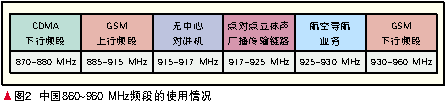 圖2顯示了中 國在860~960 MHz頻段的頻率使用現狀,920~925 MHz的RFID頻段實際上是立體聲廣播點對點傳輸業務頻段分出5 MHz與RFID共用,與GSM上/下行頻段只有5 MHz的頻率間隔,與無中心對講機系統只有3 MHz的頻率間隔。