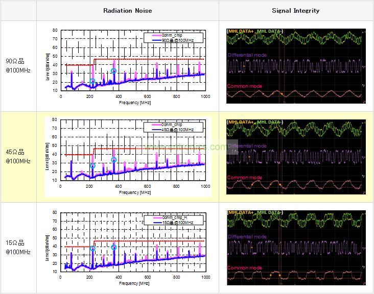 使用共模扼流線圈時的靜噪效果及信號波形評測圖5顯示的MHL信號線使用各種共模扼流線圈時的輻射噪聲/信號波形評測結果。共模扼流線圈在產生噪聲的30MHz~1GHz頻率段內,按照阻抗由高到低的順序,分別使用以下3種類型(90Ω、45Ω、15Ω@100MHz) (靜態特性請參考圖6) 來進行測量。