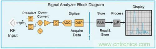 在對系統干擾進行特征分析時,系統工程師通常依賴信號分析儀來完成長時間的連續錄存,如圖1所示。長時間錄存的主要局限是,測試設備中板子的內存容量不夠大。目標信號首先進入分析儀的RF輸入,隨后被處理,產生圖1右側所顯示的波形。假設系統使用了一個固定本機振蕩器,該儀器捕獲帶寬內的所有目標信號在到達藍色豎線之前,都會經過實時處理。一旦采樣信號進入緩存或RAM中,該儀器便不再關注新進入的數字樣本。相反,它必須處理先前錄存的采樣數據。
