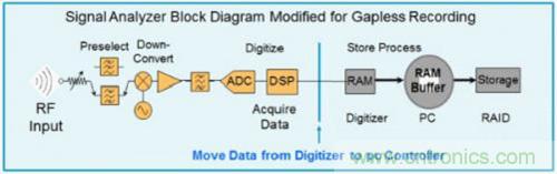 在圖2的示例中,信號分析儀已被修改為無間斷錄存。圖2中的信號分析儀與圖1中的一樣,但它包含一條高速數據鏈路或總線,使工程師可以將采集到的數據從內存中移出去。它通過旁路處理和顯示更新,同時將采集到的數據直接寫入采用環形RAM緩存的最終存儲介質,來實現數據的無間斷高帶寬錄存。工程師可以在環形RAM緩存中同時寫入和讀取數據。若在大帶寬下錄存較長時間的數據,則需獨立磁盤冗余陣列(RAID)存儲系統。