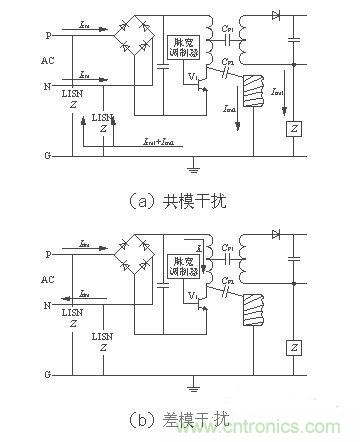 電源線噪聲是電網(wǎng)中各種用電設(shè)備產(chǎn)生的電磁騷擾沿著電源線傳播所造成的。電源線噪聲分為兩大類:共模干擾、差模干擾。共模干擾(Common-mode Interference)定義為任何載流導(dǎo)體與參考地之間的不希望有的電位差;差模干擾(Differential-mode Interference)定義為任何兩個(gè)載流導(dǎo)體之間的不希望有的電位差。兩種干擾的等效電路如圖2[1]所示。圖中CP1為變壓器初、次級之間的分布電容,CP2為開關(guān)電源與散熱器之間的分布電容(即開關(guān)管集電極與地之間的分布電容)。