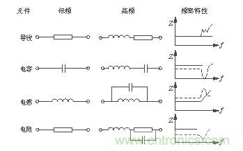 如圖4所示,在高頻工作下的元件都有高頻寄生特性[2],對其工作狀態(tài)產(chǎn)生影響。高頻工作時(shí)導(dǎo)線變成了發(fā)射線、電容變成了電感、電感變成了電容、電阻變成了共振電路。觀察圖4中的頻率特性曲線可以發(fā)現(xiàn),當(dāng)頻率過高時(shí)各元件的頻率特性產(chǎn)生了相當(dāng)大的變化。為了保證開關(guān)電源在高頻工作時(shí)的穩(wěn)定性,設(shè)計(jì)開關(guān)電源時(shí)要充分考慮元件在高頻工作時(shí)的特性,選擇使用高頻特性比較好的元件。另外,在高頻時(shí),導(dǎo)線寄生電感的感抗顯著增加,由于電感的不可控性,最終使其變成一根發(fā)射線。也就成為了開關(guān)電源中的輻射干擾源。