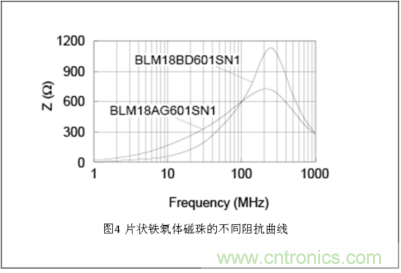 一般來說,片狀鐵氧體磁珠是以100MHz的阻抗值來決定其規(guī)格的。但與此同時, 也存在著諸多擁有相同阻抗值的不同產(chǎn)品,這是因為它們的曲線形狀各不相同。圖4所示的就是其中一例。BLM18AG601SN1與 BLM18BD601SN1都是100MHz阻抗值為600Ω的片狀鐵氧體磁珠,但從它們的阻抗波形可以看出,與BLM18AG601SN1較為平穩(wěn)上升 的曲線相比,BLM18BD601SN1的曲線則呈急速上升的趨勢。