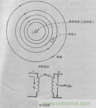 兩個導體相耦合的隨時間變化的磁場,可用兩個電路之間的互感來表示,見下圖: