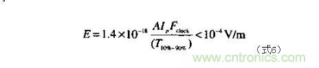 要想精確計算一個數(shù)字產(chǎn)品的輻射強(qiáng)度等級是件不現(xiàn)實的事情,因為有太多的因素會影響結(jié)果。下式表示了一個簡單的約束條件:開放的測量試驗場合,30MHZ以上,滿足FCC和VDE輻射限制的環(huán)路面積、峰值電流和上升時間。