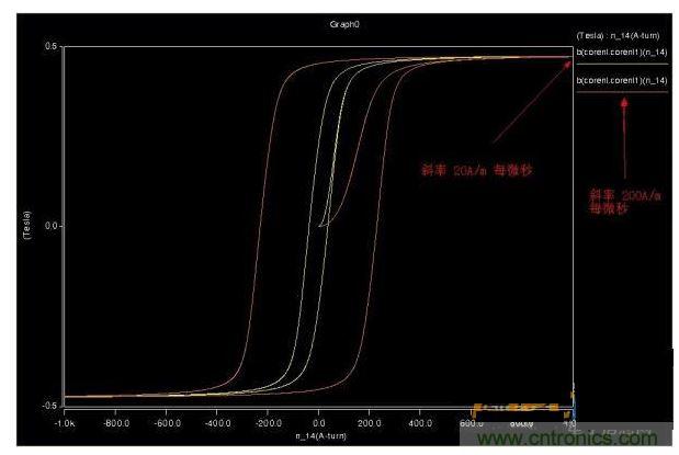 用三角波仿真了下磁芯,磁滯回線方正了很多,也不會(huì)因?yàn)檎乙?guī)律產(chǎn)生嚴(yán)重的拖尾效應(yīng)。圖2是同頻率不同幅度。圖3同斜率不同幅度的。