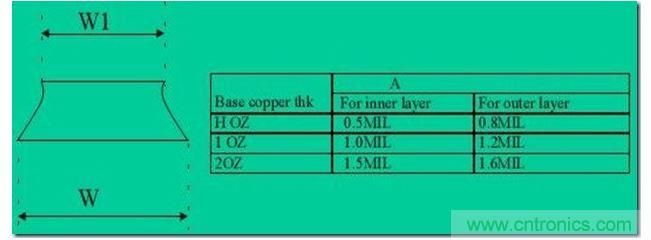 走線厚度T與該層的銅厚有對(duì)應(yīng)關(guān)系,具體如下: