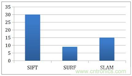 為了讓讀者了解FPGA對特征提取與位置追蹤的加速以及節能,下面我們關注加州大學洛杉磯分校的一個關于在FPGA上加速特征提取與SLAM算法的研究。圖5展示了FPGA相對CPU在執行SIFT feature-matching、SURF feature-matching以及SLAM算法的加速比。使用FPGA后,SIFT與SURF的feature-matching分別取得了30倍與9倍的加速,而SLAM的算法也取得了15倍的加速比。假設照片以30FPS的速度進入計算器,那么感知與定位的算法需要在33毫秒內完成對一張圖片的處理,也就是說在33毫秒內做完一次特征提取與SLAM計算,這對CPU會造成很大的壓力。用了FPGA以后,整個處理流程提速了10倍以上,讓高幀率的數據處理變得可能。