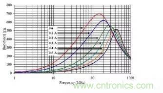 前面簡(jiǎn)單介紹了EMI磁珠的基本特性曲線。從磁珠的阻抗曲線來看,其實(shí)它的特性就是可以用來做高頻信號(hào)濾波器。需要注意的是,通常大家看到的廠家提供的磁珠阻抗曲線,都是在無(wú)偏置電流情況下測(cè)試得到的曲線。但大部分磁珠通常被放在電源線上用來濾除電源的EMI噪聲。而在有偏置電流的情況下,磁珠的特性會(huì)發(fā)生一些變化。下面是某個(gè)0805尺寸 額定電流500mA的磁珠在不同的偏置電流下的阻抗曲線。大家可以看到,隨著電流的增加,磁珠的峰值阻抗會(huì)變小,同時(shí)阻抗峰值點(diǎn)的頻率也會(huì)變高。