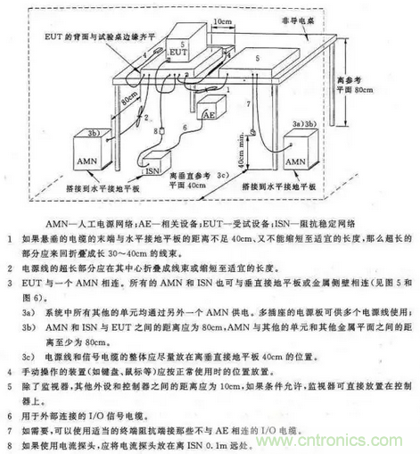 僅是EUT發(fā)射的,不會有電網的騷擾混入。另一作用是為測量提供一個穩(wěn)定的阻抗,因為電網的阻抗是不確定的,阻抗不一樣EUT的騷擾電壓值也不相同,所以要規(guī)定一個統一的阻抗,通常為50Ω。AMN實際上是個雙向低通濾波器,電網中的騷擾由50μH和1.0μF的濾波器濾掉,不能進人騷擾測量儀,而EUT發(fā)射的騷擾由于50μH濾波器的阻擋不能進人電網,只能通過0.1μF電容進入騷擾測量儀。測量儀的輸入阻抗是50Ω,所以EUT騷擾的負載阻抗約等于50Ω。對于50Hz的工頻電源,仍然可以通過AMN向EUT供電。圖15中的AMN僅是一種基本結構,由基本結構可以組成V型AMN,用于測量電源中相線—地線和零線—地線的不對稱騷擾電壓,見圖16。也可組成Δ型AMN,除了測量線-地間的不對稱騷擾電壓外還可以測量相線—零線間的對稱騷擾電壓,見圖17。測量時EUT和AMN的布置、連接線的長度和走向等都應按標準規(guī)定的要求進行。AMN外殼要良好接地,否則將影響電網和EUT之間的隔離。圖18為臺式設備的傳導騷擾測量布置圖。