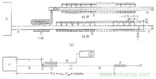 當測量頻率升高到30MHz以上時,人工電源網絡AMN內的電感、電容器分布參數影響加大,使其不能起到良好的隔離和濾波作用;所以應采用功率吸收鉗進行測量。功率吸鉗的結構如圖19(a)所示。