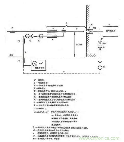 其中C是電流探頭,包括鐵氧體環(huán)和探測線圈,作用是測量電源線上的騷擾共模電流。D是鐵氧體環(huán)組,作為騷擾共模電流的穩(wěn)定負載,吸收騷擾功率,并用于隔離EUT和電網。如果在50MHz以下鐵氧體環(huán)組D不能充分起到射頻隔離作用,則應在電網端再加一個輔助吸收鉗F,它也是由鐵氧體環(huán)組成。E也是鐵氧體環(huán)組,用于吸收外場在電流探頭引出電纜上產生的共模電流,以免影響測量結果。測量布置如圖19(b)所示,測試應在屏蔽室內進行,電源線長度應大于6m,即大于30MHz的半波長加上吸收鉗的長度。對于每一個測試頻率點,吸收鉗都應沿著電源線移動,找出最大值,因為共模電流在導線上是以駐波形式出現的。功率吸收鉗測量系統應事前進行校準,得到修正因子—頻率曲線。校準布置如圖20所示。