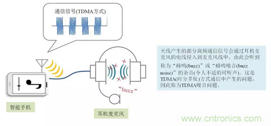 通信電波的高頻信號侵入到麥克風線中時,揚聲器會發出稱為"蜂鳴(buzz)"或"蜂鳴噪音(buzz noise)"的雜音(令人不適的可聽聲)。由于以前在TDMA(時分多址)方式的電話中出現過重大問題,因此普遍稱為TDMA噪音。圖1所示為在智能手機中連接耳機麥克風時產生TDMA噪音事例的示意圖。進行蜂窩通信時,高頻信號侵入到麥克風線中導致產生TDMA噪音。