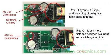 圖2:從電路板布局進行 EMI 掃描,其中 AC 輸入與開關(guān)電路距離較近