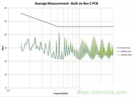 圖3:從電路板布局進行 EMI 掃描,其中 AC 輸入與開關(guān)電路之間距離較大