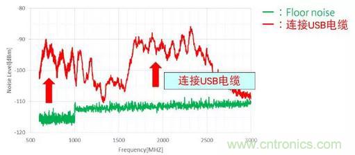 圖3:連接USB電纜前后進(jìn)入天線的噪聲的對比