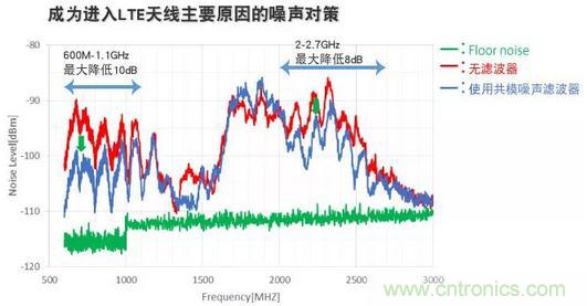 通過這些對策,如圖8所示,天線中進(jìn)入的噪聲最大可降低20dB,LTE的接收靈敏度取決于頻帶,改善了8dB。