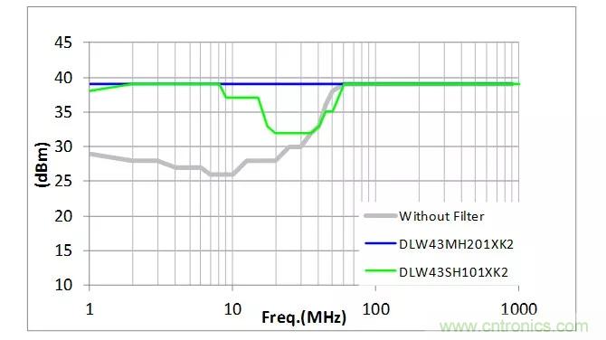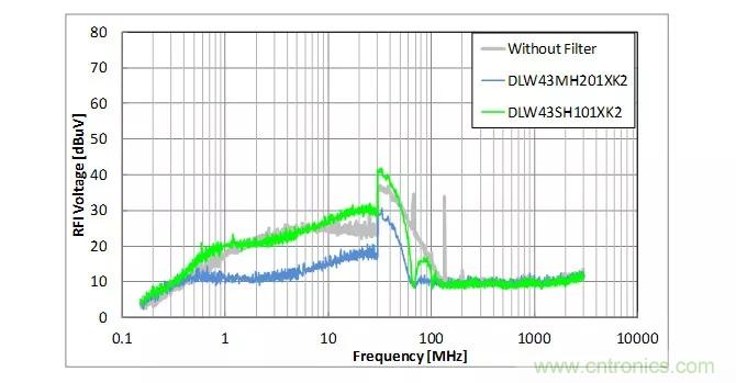 支持CAN、FlexRay的DLW43SH101XK2在有些頻率下噪聲會增加,降噪效果不佳,但使用支持100Base-T1的DLW43MH201XK2能有效地降噪。
