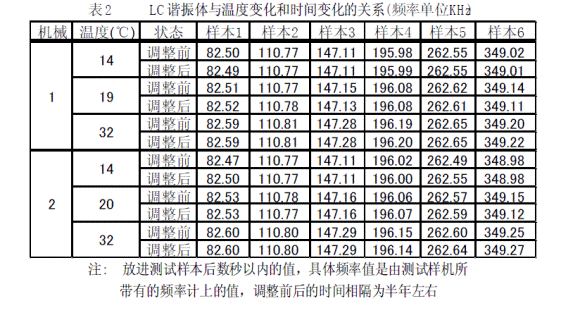 根據(jù)本文中所推出的原理試作了LC諧振頻率測試機分別對6個種類LC諧振體樣本(產(chǎn)品)進行測試。本LC諧振測試機已應用在6個種類LC諧振體的生產(chǎn)和產(chǎn)品檢驗上。具體結(jié)果參照表1和表 2。