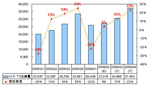拓墣研究員張乘維表示,隨LCD TV需求的逐季增溫,全球LCD TV出貨量預估將從2009年第二季的2,701.6萬臺逐季攀升到第四季的3,740.3萬臺;由于上半年LCD TV超乎市場預期熱銷,預估下半年LCD TV出貨年成長將稍稍趨緩,縮減至11%~14%。