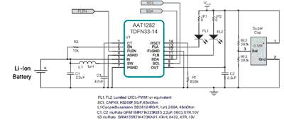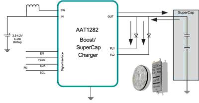 為更好地實現這一目標, AAT1282具有防止啟動時過大尖峰電流沖擊的內置電路、一個固定的800mA輸入電流限制器、以及一個超級電容充滿電后的負載斷開電路。其輸出電壓受限于內部過壓保護電路,可防止轉換器和超級電容免受一個開路LED(開路條件下)的損害。