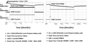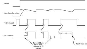 圖3顯示了采用2個以1A電流驅動的LED閃光燈和1個以2A電流驅動的LED閃光燈的測試結果。正如所見到的一樣,超級電容可以很容易地提供閃光持續120ms所需的電流,同時保持電源電壓充分地高于LED的VF電壓。在兩次閃光之間,超級電容以一個較慢的速率再充電,充電時間在外部設定,可針對不同的電池尺寸和化學原理進行優化。圖4顯示了閃光功能和電影模式選項的數字控制。