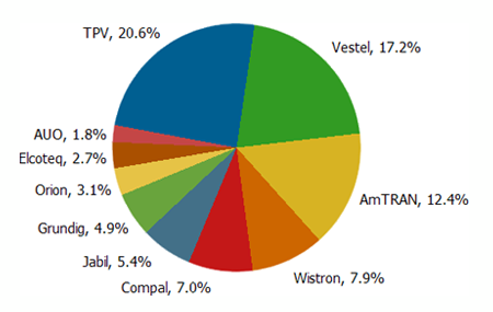 從代工廠商排名來看,TPV主要客戶有Vizio、AOC以及Philips,第一季市占率為20.6%排名居首;Vestel以17.2%市占率居次,而其主要生產(chǎn)供貨給自有品牌、白牌業(yè)者以及賣場(chǎng)品牌機(jī)種;第三名代工廠商為AmTRAN,第一季市占率12.4%,該公司主要客戶為Vizio。同時(shí)隨著中國(guó)液晶電視出貨對(duì)全球液晶電視市場(chǎng)日益重要,以及國(guó)內(nèi)品牌廠商市占率超過海外品牌廠商,DisplaySearch在每季度報(bào)告中均包括有中國(guó)電視廠商供應(yīng)鏈的詳細(xì)分析,對(duì)關(guān)心中國(guó)市場(chǎng)的客戶是一份相當(dāng)值得參考的資料。
