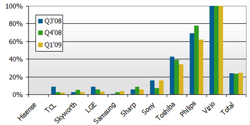 圖一 Q3’08 - Q1’09 全球前十大液晶電視品牌廠商外包比率
