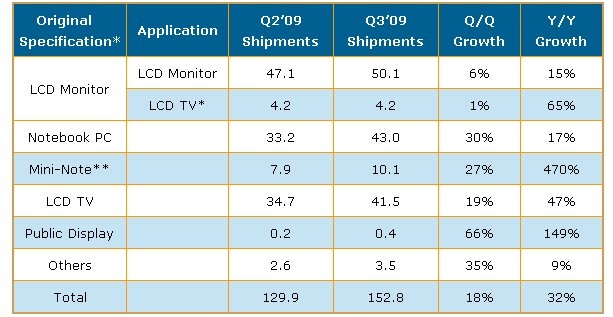 ** 上表中Notebook PC面板出貨包括10.x”尺寸應用于mini-note (也稱作netbook) PC的部分.