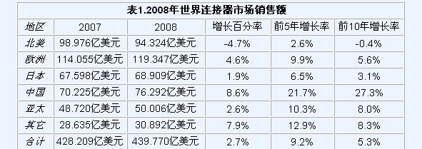 北美地區的連接器銷售自2007年便出現負增長(-2.5%),2008衰退進一步加深,降幅達到-4.7%,2008年銷售額僅94.324億美元,近5年的復合年增率僅為2.6%。