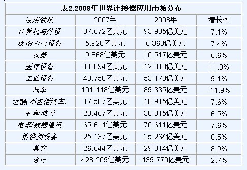 專業的連接器市場研究公司-Bishop&Associates于2009年4月公布了2008年世界連接器工業市場數據,數據顯示受世界經濟危機的拖累,2008年世界連接器工業銷售增幅急劇下滑,與上一年相比,僅增長2.7%,而2007年的增幅為7.2%,盡管如此,連接器工業仍然實現了6年的連續增長(2003 年11.2%, 2004年17.9%,2005年6.2%,2006年12.6%,2007年7.2%,2008年2.7%),與經濟危機下其它電子元器件普遍負增長的糟糕表現相比,這一增長數字,是令人欣慰的。