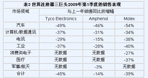 2009年第一季度已經過去,連接器產品訂單劇降41.7%,銷售則下挫了35.7%,這兩項數據結果均創下了連接器工業的歷史新低。在上一次表現最糟糕的2002年第四季度,銷售和定單下降了31.2%。所有最終應用市場均報告直線下降,一片蕭條跡象。三家世界最大的連接器公司泰科電子(Tyco Electronics)、安費諾(Amphenol)和莫列克斯(Molex)也均報告與上一年同比銷售嚴重下降,如下表3所示。