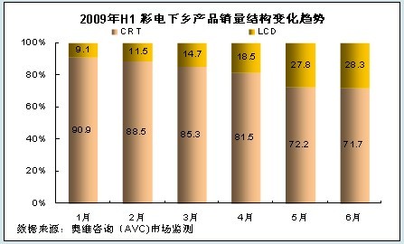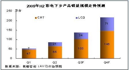 根據奧維咨詢(AVC)對三四級以及農村市場的理解和研究,結合下半年彩電業形勢,我們認為:隨著各省對家電下鄉工作的進一步開展以及彩電市場傳統旺季的到來,2009年第三、四季度,彩電下鄉規模將繼續保持較快速度增長,同時LCD產品的比重也將進一步增加,到第四季度,LCD產品銷量比重將占彩電下鄉市場的三分之一,銷售額比重將突破50%。