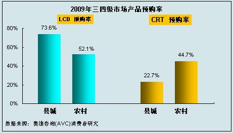 奧維咨詢(AVC)對主要下鄉省份的三四級市場研究結果顯示,在有計劃于2009年購買彩電產品的人群中,他們更傾向于購買LCD產品,;而即使在農村市場,CRT產品的預購率仍要低于LCD產品,扣除消費者購買能力因素,LCD在農村市場的被接受程度仍然較高。