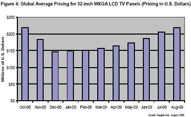 2008 年10 月至2009 年8 月32-inch WXGA LCD 面板的全球平均價格。