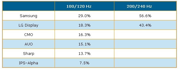 根據(jù)DisplaySearch調(diào)查指出,第二季全球采用倍頻及雙倍頻掃描技術(shù)液晶電視面板出貨達到640萬片,出貨量市占率達18.3%,較上一季提高2%。以廠商別來看,Samsung以29%市占率居100/120Hz出貨量排名冠軍,LG Display以18.3%是占率居次,CMO(奇美)、AUO(友達)、Sharp與IPS-Alpha分居第三到六名。在雙倍頻面板出貨量方面,主要為韓國二家面板廠商所主導,市占率如表二所示。