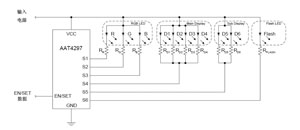 如果有需要也可并接多個(gè)RGBLED。S4接D1~D4白光LED,它用作彩色主顯示屏背光照明,S6接閃光燈LED,作相機(jī)閃光燈用。根據(jù)手機(jī)的不同工作狀態(tài),由μP向EW/SET輸入不同的數(shù)字信號(hào),可實(shí)現(xiàn)LED的負(fù)載管理。數(shù)字信號(hào)的頻率可高達(dá)1MHz。利用輸入EN/SET信號(hào)使LED亮的時(shí)間與滅的時(shí)間交替進(jìn)行,改變亮、滅的時(shí)間,可以實(shí)現(xiàn)LED亮度調(diào)節(jié)。