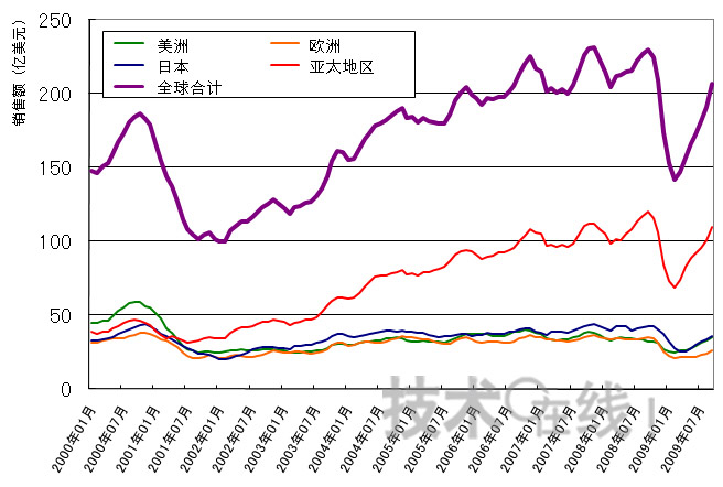 另外,這是自08年11月(208億7000萬美元)以來,單月銷售額首次超過200億美元。這一增長率將持續(xù)下去。09年第三季度(7~9月)的銷售額為619億美元,較09年第二季度的517億美元大幅增長了19.7%。與08年第三季度相比,跌幅縮小到了10.1%。另外,09年第二季度的銷售額比上年同期減少了20%。