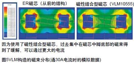 一直以來(lái),一般的電感是以Ni-Zn系的鐵氧體作為磁芯的,這種材料雖然強(qiáng)度較高,但是飽和磁束密度較低,高溫時(shí),飽和磁束密度會(huì)降低,在電子部件驅(qū)動(dòng)日趨低電壓,大電流化的今日,這類小型化產(chǎn)品無(wú)法對(duì)應(yīng)大電流。要在高溫環(huán)境下通過(guò)更大的電流,就要使用由飽和磁束密度高且損耗小的Mn-Zn鐵氧體磁芯構(gòu)成的電感。一般而言,Mn-Zn鐵氧體材料的電感,磁芯的中腳部分會(huì)形成Gap,磁芯的中腳部分開始較容易飽和。如圖4 VLM所示,結(jié)構(gòu)是由口字形磁芯(磁性結(jié)合型磁芯)和棒狀磁芯組成。采用了這種構(gòu)造后,將本來(lái)容易產(chǎn)生飽和的中心磁芯的中腳部分分成上下兩部分,在上下根部形成Gap,不易出現(xiàn)部分飽和,能夠容許更大電流通過(guò)。另外,由于Gap分散在卷線的上下兩端,可以減少?gòu)腉ap泄漏的磁束對(duì)卷線的影響。過(guò)電流損失減少,電源效率也提高了。再者,還可使用金屬磁芯的電感。它的飽和磁束密度更高,受溫度影響飽和電流的變化很少。如圖6 ERM6050所示。金屬磁芯的電感還有另外一款復(fù)合金屬型的電感(圖7 SPM系列)。