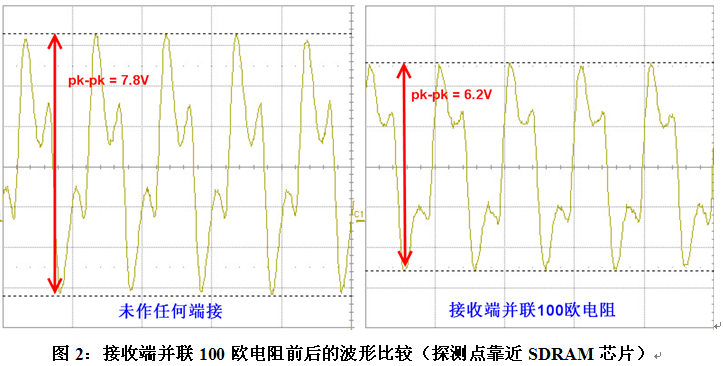 幾天后,我們在實驗室重新測試了該系統的時鐘,測試儀器為SDA816Zi(帶寬16G,采樣率40G),探頭為ZS1500(帶寬1.5GHz)。由于待測試信號頻率僅為100MHz,所以通常1G以上示波器和探頭足以滿足需求(注:對于某些上升時間很快的時鐘,比如PCIExpress的100MHz時鐘,1GHz的帶寬是不夠的,需要更高帶寬的示波器)。下圖2左圖為未作端接時在SDRAM芯片端測量時鐘波形,右圖為靠近SDRAM顆粒并聯100歐電阻后的波形,兩者相比,前者的過沖高達7.8V,電路板不能正常工作;而后者過沖較小,電路板可以正常工作。