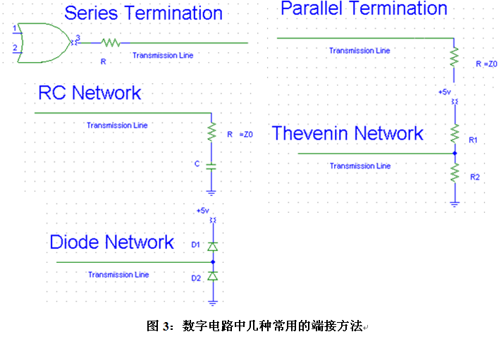 盡管并聯了100歐電阻后電路板能正常工作了,但是接收端測量到的峰峰值高達6.2V,對于SDRAM芯片3.3V的工作電壓來講還是比較大的,長期工作可能會導致內存芯片出問題,所以,我們還需改進端接策略。在信號完整性書籍中,通常有串聯匹配、并聯匹配、RC網絡、戴維南網絡等端接方法,如下圖3所示。相比并聯匹配,串聯匹配不用提供DC電流到地或者電源,不會對輸出的高低電平產生影響,能減小過沖和EMI,所以我們接著嘗試串聯匹配下的信號質量。
