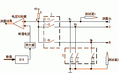 實現自動測量的前提是將被測元件引腳連入探測電路中,為此探測設備設置若干個測量頭,通過電纜引出,測量頭可掛接各種測試夾具與元件引腳建立連接,測量頭的數量決定了同一批連入探測電路的引腳數。然后在程序控制下探測儀按組合原則依次將被測"引腳對"一一納入測量通路。在測量通路中將"引腳對"之間的通/斷路狀況呈現為引腳間有無電阻,測量通路將其轉換為一個電壓量,由此判斷它們之間的通/斷路關系并加以記錄。