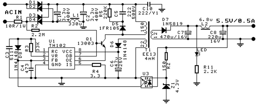 TH102采用穩(wěn)壓管、光耦發(fā)光管(圖2中Z1、U3、RZ)為輸出電壓基準,RZ基于光耦發(fā)光管壓降為Z1提供基電流,改變該基電流(既改變RZ)可小幅改變Z1穩(wěn)壓值,因此,若需較高精度輸出電壓可調(diào)校RZ,調(diào)校RZ可采用成批穩(wěn)壓管分為幾檔,每檔穩(wěn)壓管對應(yīng)一個RZ;或TH102采用TL431(圖3中U2、R6、R7、R8、R9、R10、C9)電路為輸出電壓基準,基準精度較高和無需調(diào)校。TH102采用光耦隔離反饋電路(圖2中Z1、U3、RZ、C4,圖3中U2、R6、R7、R8、R9、R10、C9、C4)。