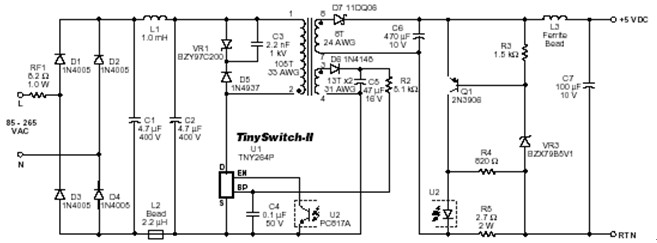TNY264采用穩(wěn)壓管、光耦發(fā)射二極管為輸出電壓基準和光耦隔離反饋電路。