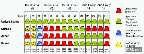 圖中可見,美國、歐洲、日本、南韓等地對超寬頻的頻段開放程度,美國因FCC的規(guī)令而全面開放,