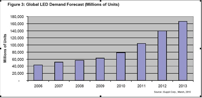 需求顯然超過了供給,而且LED市場至少在未來三年內(包括2010年在內)將保持兩位數的增長速度,iSuppli公司預測今年可能出現嚴重供應不足,除非增加額外產能來滿足日益增長的需求。