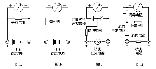 如圖1d所示,在表頭上并聯和串聯適當的電阻,同時串接一節電池,使電流通過被測電阻,根據電流的大小,就可測量出電阻值。改變分流電阻的阻值,就能改變電阻的量程。