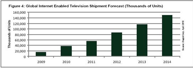 同樣,隨著品牌廠商努力延緩價(jià)格下跌速度和吸引消費(fèi)者來更換其原有的老式平板電視,未來幾年對(duì)于IETV的推廣活動(dòng)將會(huì)增強(qiáng)。iSuppli公司預(yù)測(cè),2014年IETV市場(chǎng)將從2009年的1470萬臺(tái)增長(zhǎng)到1.49億臺(tái),復(fù)合年度增長(zhǎng)率為58.9%。
