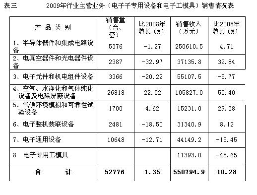 2009年各類電子專用設(shè)備和電子專用工模具的銷售情況見表三。