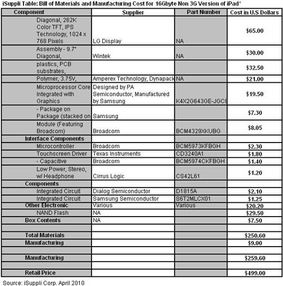 根據對16GB非3G版iPad的物理拆機分析,iSuppli公司估計低端16GB非3G版iPad的材料成本(BOM)為250.60美元。如果計入生產費用,成本是259.60美元。